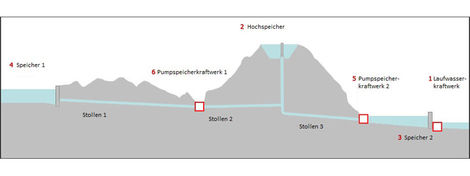 Das Kraftwerk greift auf einen Hochspeicher als Oberwasserbecken und den Stauraum eines Laufwasserkraftwerks als Unterwasserbecken zurück. Der Triebwasserweg der Anlage besteht aus einem vertikalen Schacht und einem ca. 1000 m langen Betonstollen, in dessen Anschluss sich eine Verteilrohrleitung befindet. Diese bedient 3 Maschinensätze, die jeweils aus einer Francis-Turbine und einer zweiflutigen, zweistufigen Speicherpumpe bestehen. Die gesamte Verteilrohrleitung ist fest im Berg einbetoniert, nur etwa 3,5 m ragen an den Enden der sechs Äste der Verteilrohrleitung ins Freie und sind von außen zugänglich. Die Francis-Turbine und die Speicherpumpe bilden gemeinsam mit dem Motorgenerator und einer kleinen Anwurf-Turbine einen von drei Maschinensätzen dieser Kraftwerksanlage.