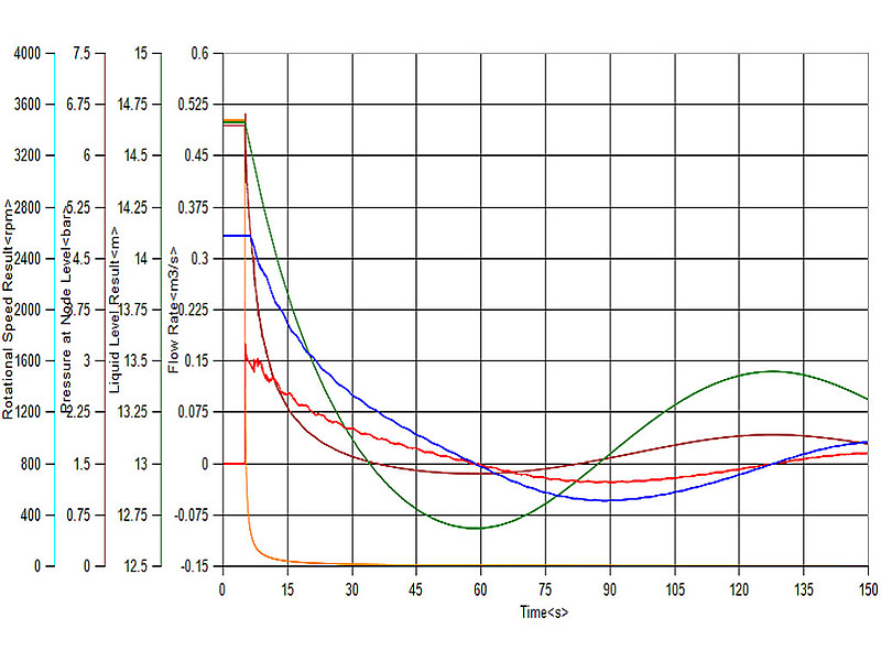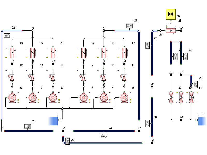 Ausgehend von einer ausführlichen stationären IST-Anlagenanalyse der Druckverluste wurden Summenpumpenkennlinien sowie Anlagenkennlinien errechnet und es wurde eine Übersicht über die möglichen Pumpenkombinationen und die sich einstellenden Durchflüsse erstellt. Die nachfolgende transiente Analyse betraf: