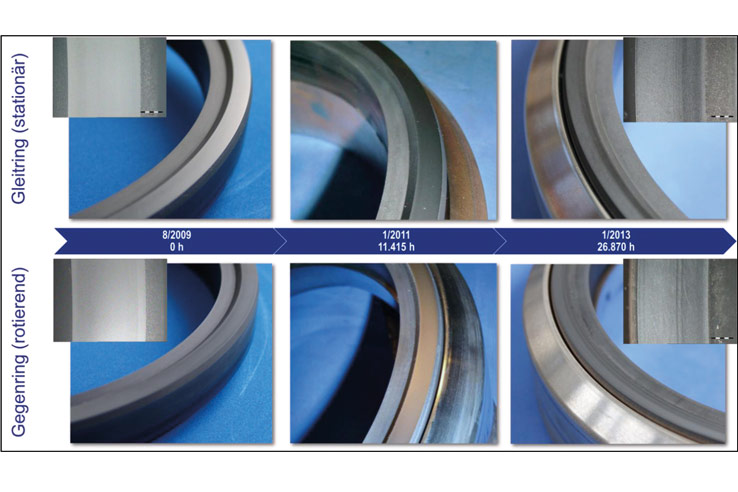 Zunächst wurde an zwei konventionellen Siliziumkarbid-Dichtungen erreicht, was man normalerweise vermeiden möchte: Die konventionellen Gleitringdichtungen wiesen nach kurzer Zeit (600 h) das zu erwartende Schadensbild auf, womit der praktische Beweis für die exakte Nachbildung der Wirklichkeit erbracht war.