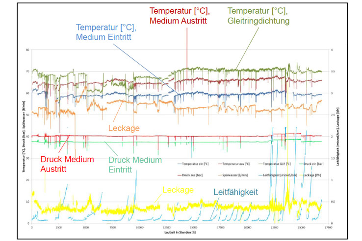Beispielhaft sind die Versuchsdaten der Gleitringdichtung der Antriebsseite (DE: driving end) als Langzeitmitschrieb in der Abbildung unten dargestellt. Die unterste Linie stellt die Leitfähigkeit dar, bei der zu erkennen ist, dass sie über jeweils lange Zeiträume von mehreren Tausend Betriebsstunden unter der gewählten Schwelle von 0,1 μS/cm liegt, bei Erreichen der Leitfähigkeit von 1 μS/cm wird das Ionentauscher-Aggregat regeneriert. Die Druckbelastung (Pressure IN, OUT) wird während der gesamten Versuchsdauer konstant gehalten