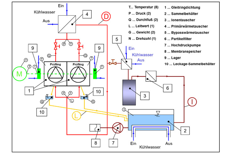 In der obigen Prüfstand-Abbildung ist links die Kühlung, in der Mitte die Wasseraufbereitung (blau), darüber der Datenloggerschaltschrank, rechts der Prüfling mit Antriebsmotor und darunter die Leckagemessung zu sehen. Nicht im Bild sind die Schaltschränke für die Dauerlaufsteuerung und -Überwachung sowie die Versuchsdatenaufzeichnung.