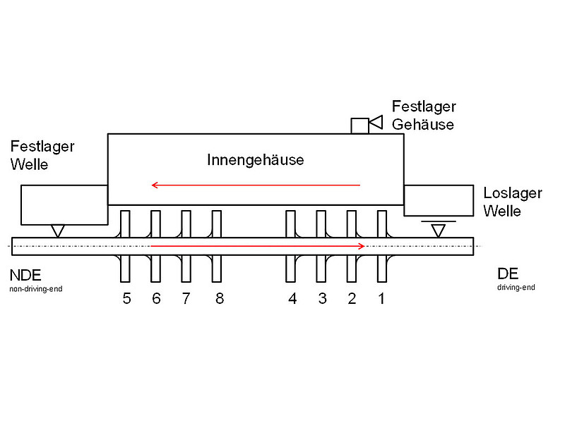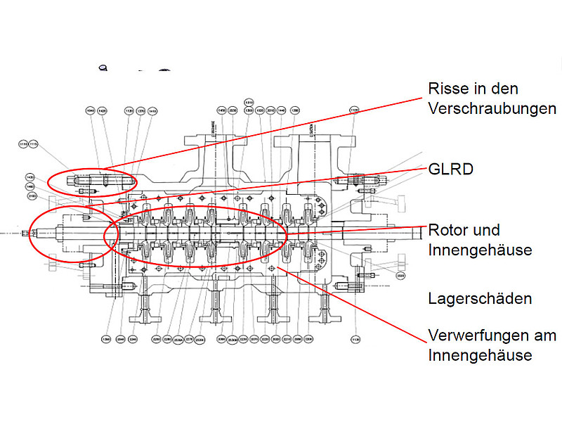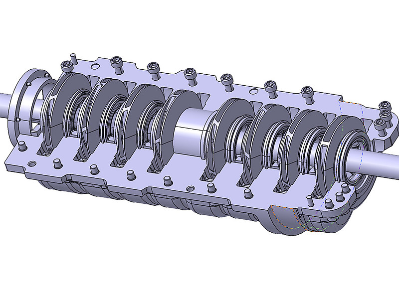 Der Auftraggeber musste im Laufe der letzten Jahre überdurchschnittlich viele Reparaturen an einer Ofeneinsatzpumpe, bei Einsatztemperaturen bis ca. 400°C, durchführen. Hierbei handelt es sich um eine 8-stufige Pumpe in einem Mantelgehäuse und einer „Back to Back“-Anordnung der Laufräder mit Doppelspiralen je Stufe. Die Problemzonen der Pumpe waren Gleitringdichtungen, Lager, Rotor und Innengehäuse sowie Verwerfungen im Innengehäuse. Es erging somit der Auftrag, ein 3D-Modell der Pumpe zu erstellen und anschließend eine thermische Berechnung durchzuführen.