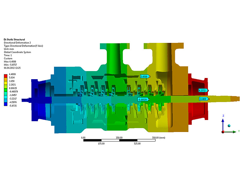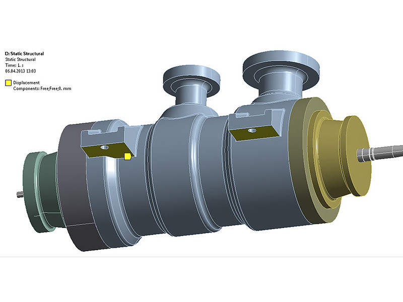 Um einen Überblick über das Verhalten der Bauteile/des Systems zu erhalten, wurde vor der numerischen 3D-Berechnung eine vereinfachte analytische Rechnung durchgeführt. Dabei wurden sowohl die Welle-Nabe-Verbindungen zwischen der Welle und den Laufrädern als auch die thermische Ausdehnung berechnet. Der Einfluss der Axialkraft und der Leckage auf das Betriebsverhalten wurde ebenfalls untersucht.
